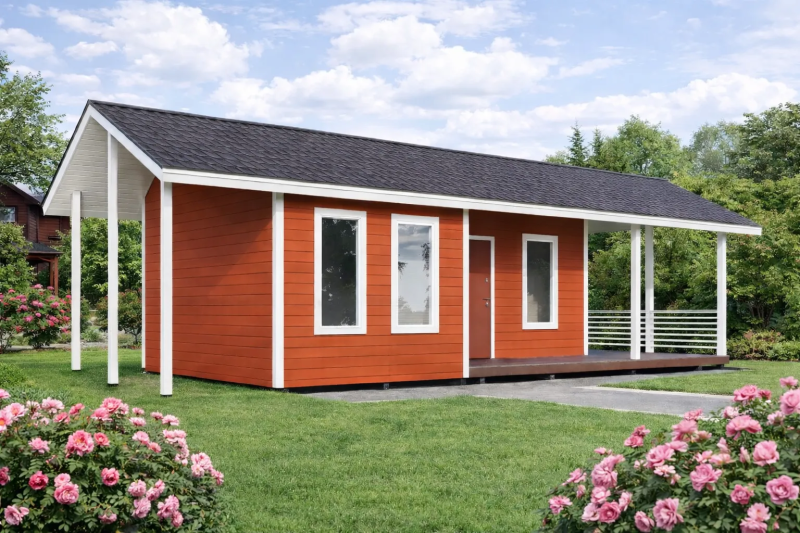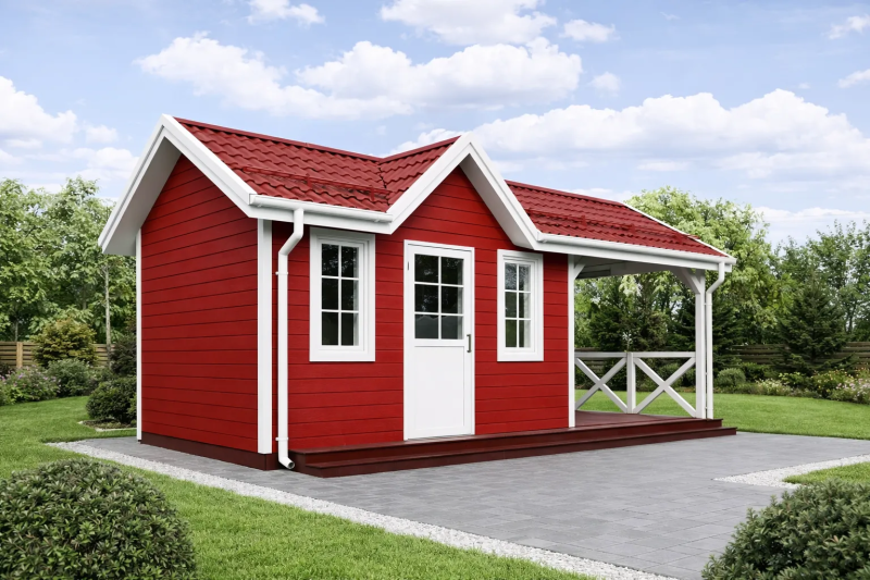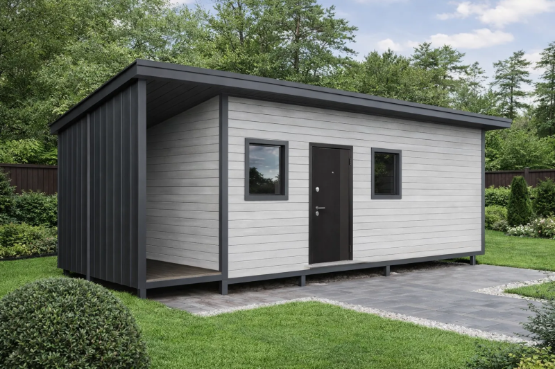 Габариты: 3×9 + навес 1,5×3 м. Площадь: 27 м²
